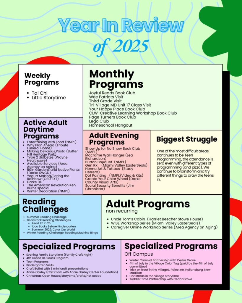 New Madison Public Library is seeking letters of interest from residents in the Tri-Village School District for an open seat on the Board of Trustees. This is a six-year term to fill a vacated seat, and will be from February, 2026 – December 31, 2031. Criteria for this position include a commitment to the goals of NMPL and recognition of the Library’s importance as a community hub. Duties of a NMPL Trustee include attendance at monthly meetings, involvement in community events, and participation on Board committees.